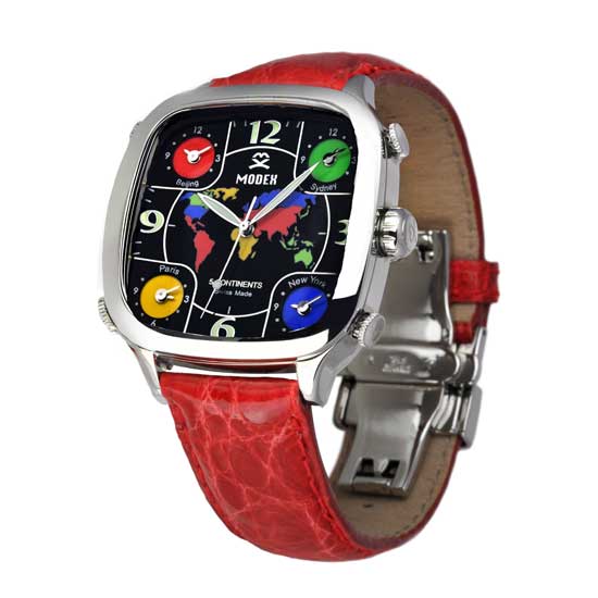 This smart analog watch is highlighted with vibrant map patterns on the black dial. It is further complemented with four sub-dials to show the time in Beijing, Paris, Sydney and New York. This fascinating wristwatch is finished with a chic strap in bold red.