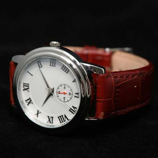 This classic analog watch features a round dial with Roman numeral hour markers. The watch goes with a polished bezel, completed with a strap of brick red complexion. This fantastic watch is light, durable and ready to go anywhere.