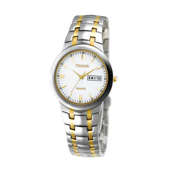 This noble analog watch features alternating golden and silver hues on the band. It comes with a round white dial with golden-toned hands and markers. The date and week display beside the 3 o’clock position is surely convenient for the wearer.
