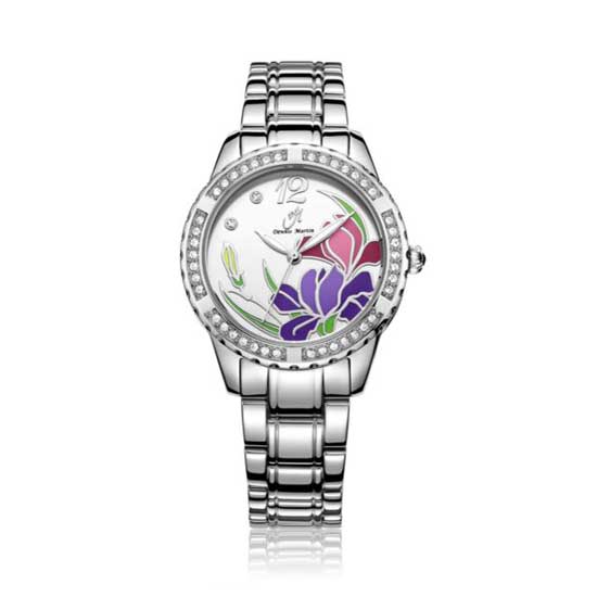 The vibrant floral patterns on the dial highlight this analog watch. The bezel is adorned with shiny stones for extra appeal. This silvery-hued wristwatch is an elegant choice for modern women.