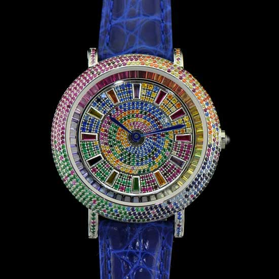 Displayed is an analog watch that comes with a colorful design. With sparkling stones of multiple colors embellishing the dial and bezel, this watch showcases a sense of sophistication and style. This high quality analog watch comes with a comfortable band in a charming blue color for your enjoyment.