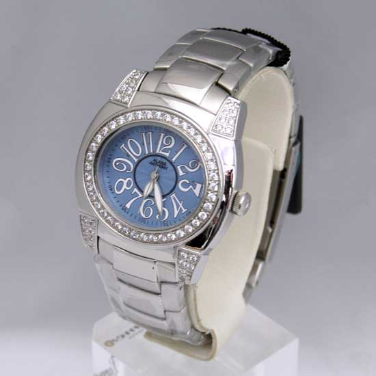 Displayed is an analog watch with a blue round dial with large number indicators. Made professionally, this watch houses a high quality movement for accuracy. This analog watch is decorated with sparkling stones for a stylish touch.