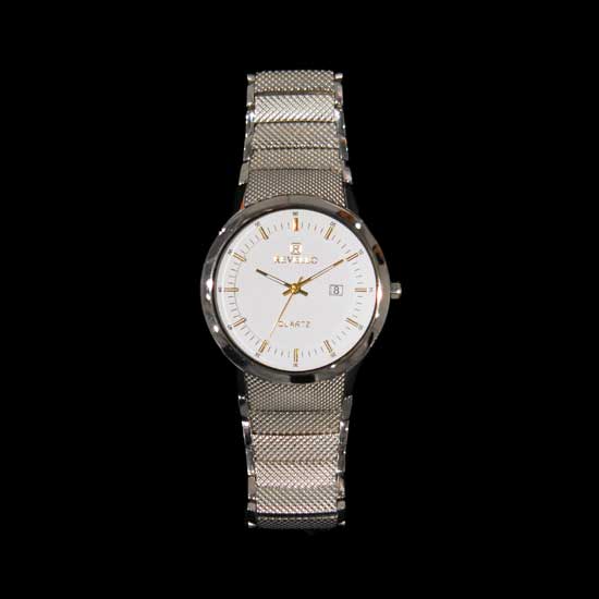 Displayed is a men's analog watch that comes in a large white dial. With golden stroke markers, this watch showcases a simplistic style that is perfect for men. Housing a high quality quartz analog movement, this watch will accompany you for a long time.