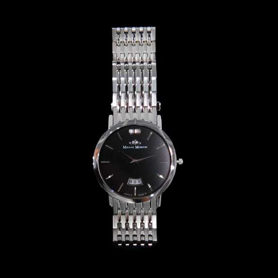 Displayed is a men's analog watch that houses a high quality quartz movement for accurate timekeeping. Made of stainless steel and a large black dial, this wrist watch has a masculine feel and is shiny and stylish. The markers are designed in slim strokes in a silvery color for added fashion.