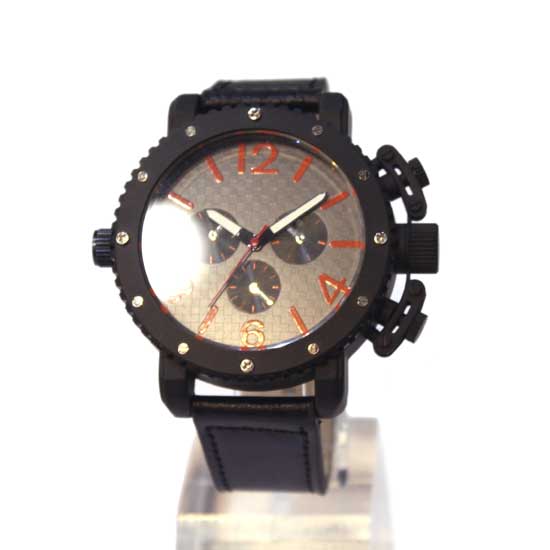 Displayed is a men's analog watch that comes in a cool black color. For a contrasting effect, the hour markers are designed in a sharp red color and the bezel is embellished with a few sparkling stones. The crowns come in different shapes for a fun style.