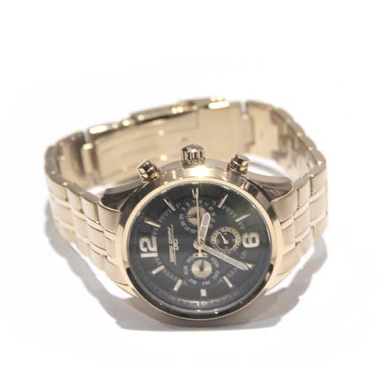 Displayed is a men's analog watch that comes in a gorgeous golden color. Featuring a round elegant black dial, this watch has golden hour markers and hands for a contrasting effect. This watch houses a quartz analog movement for accurate timekeeping.