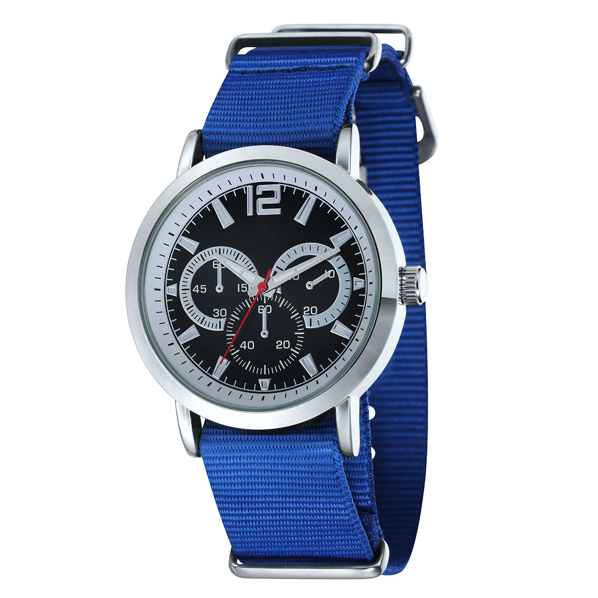 Seamlessly complement your casual ensemble with this wristwatch. The alloy case in a flawless round silhouette encompasses a three-hands movement dial topped with three sub-dials that lend an imitated chronograph look for added appeal. Set on a nylon strap in an eye-catching shade, it ensures superior durability and definitely serves as a perfect everyday companion for you.