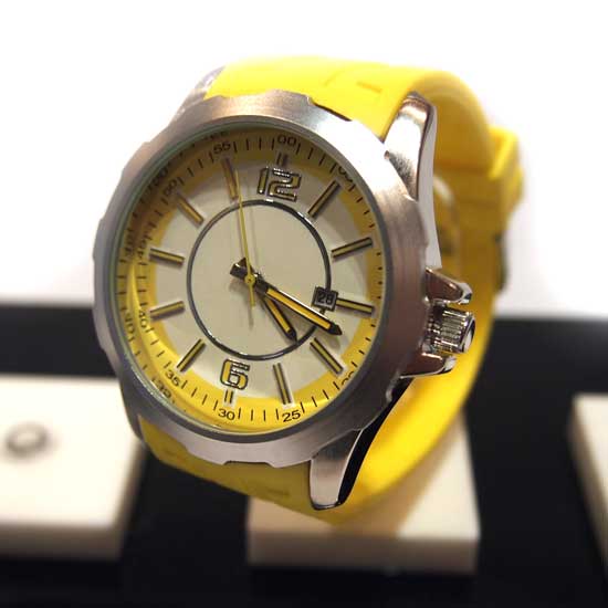 Shown is an analog watch delighting you with the brilliant yellow toned straps. This exquisite watch boasts a metallic case for added durability. Date display is designed on the dial for users’ convenience.