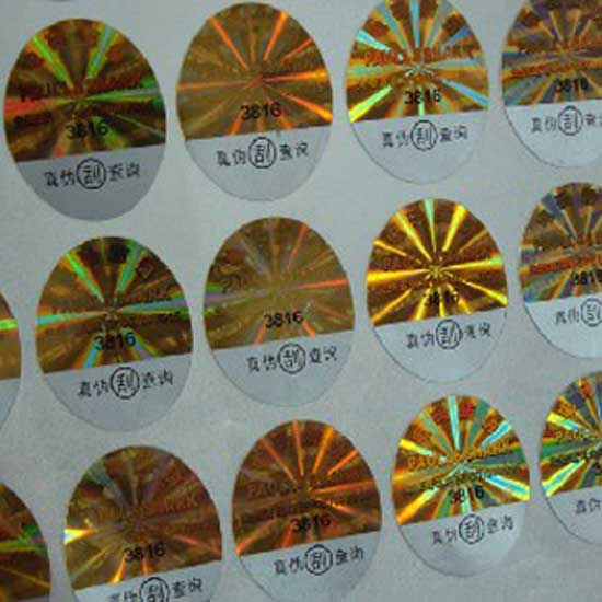 Available is an anti-counterfeiting label with a laser scratch design. It comes in a defined oval shape. The shiny appearance easily arrests customers' attention.