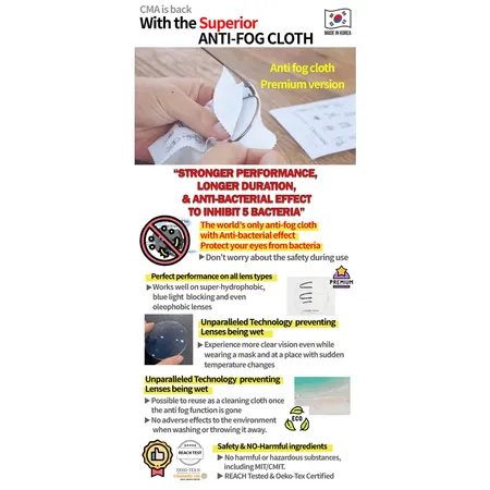 Especially, our newest item, anti-fog cloth in premium type, are better performance, longer duration, and superior antibacterial effect against 5 bacteria. This is the only and first anti-fog cloth with the antibacterial effect added in the world. It works perfectly on all lens types.