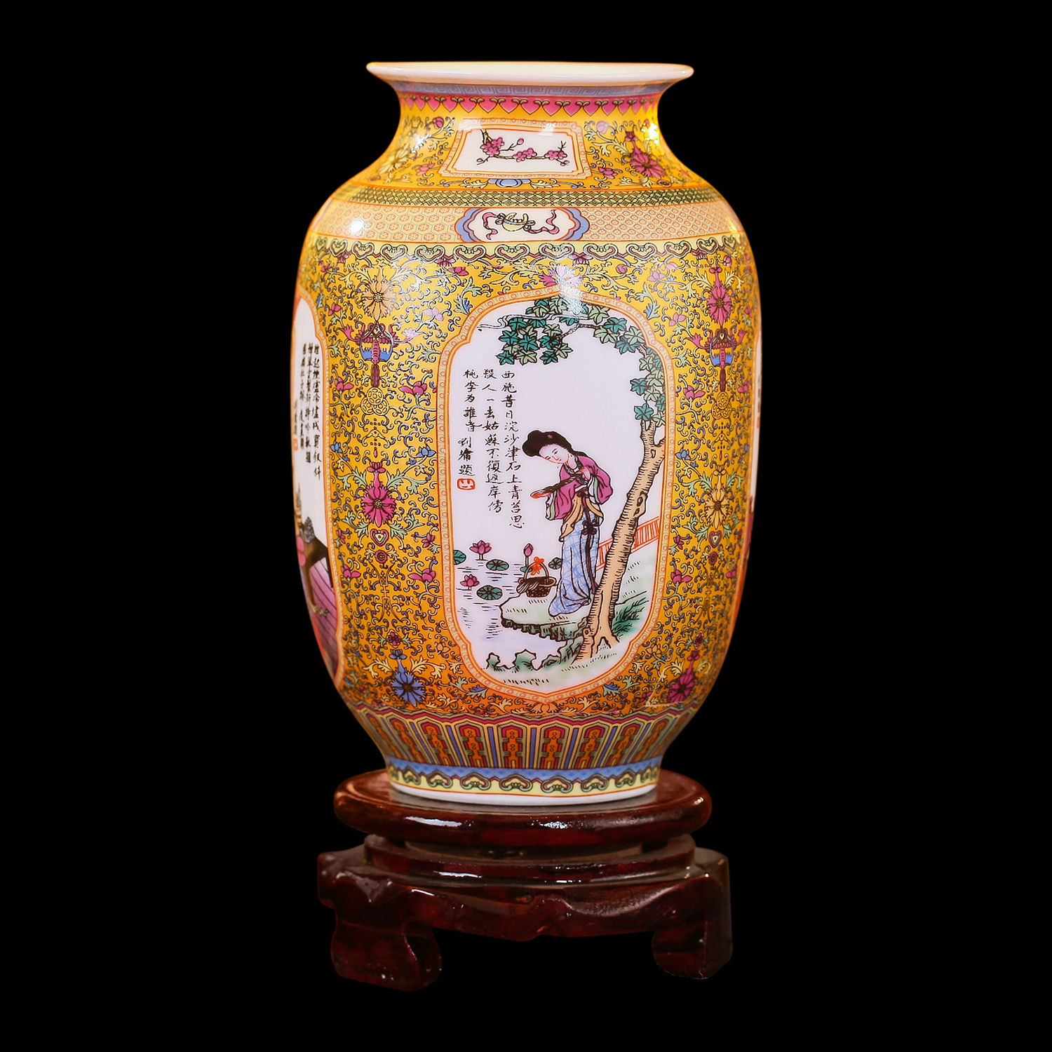 Add a great addition to your home setting with this small vase. This yellow vase is adorned with paintings of Chinese beauty on the body. The delicate and neat silhouette lends a structured yet classy look to the vase. This eye-pleasing vase would add style to your spring flowers.