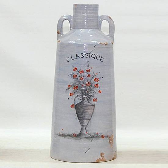 The antique vase features 2 handles. It boasts a flowerpot pattern and rust-like details for a rustic touch. Accentuate your home or garden with this tasteful piece.