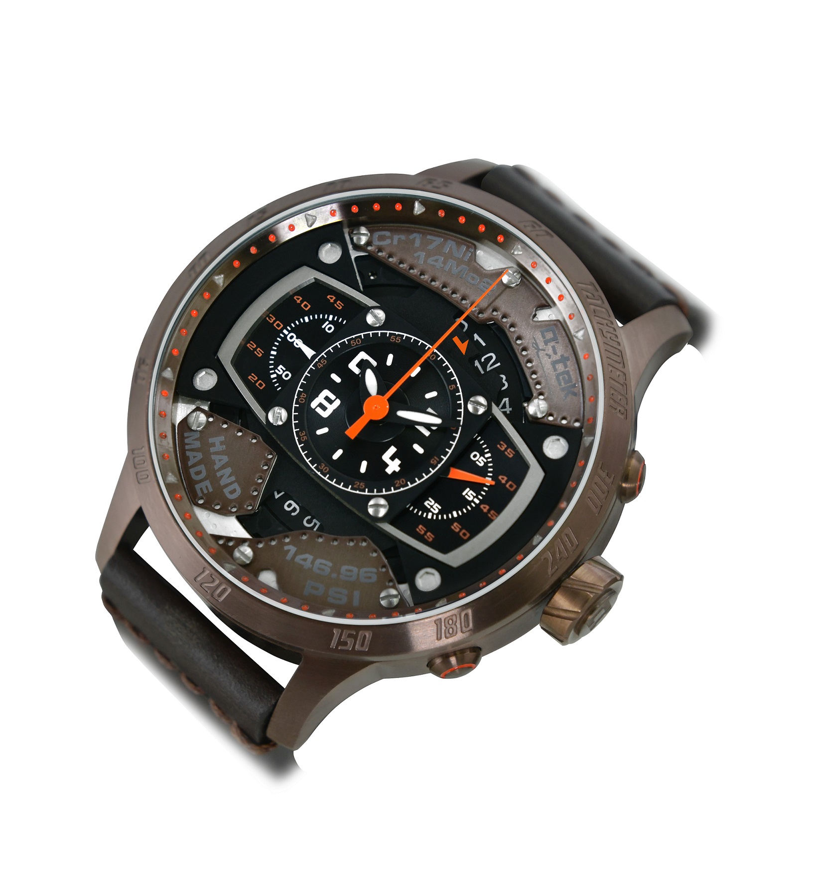 With water resistance of up to 100 meters, this wristwatch takes on a structural silhouette to support both your adventurous and professional lifestyle. The round dial draws inspirations from vehicles’ dashboards, setting on an Italian calf leather strap of steel and aluminum buckle fastening for secure wear. Date windows are further spotted at 6 and 12 for enhanced practicality.