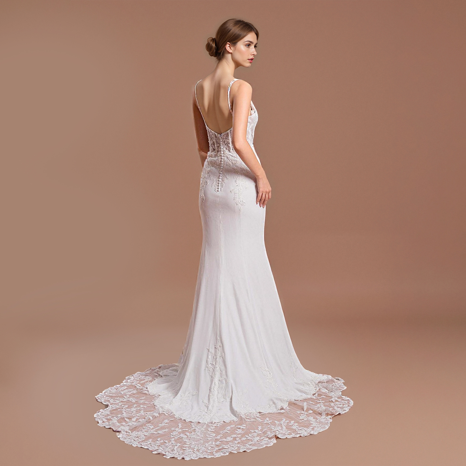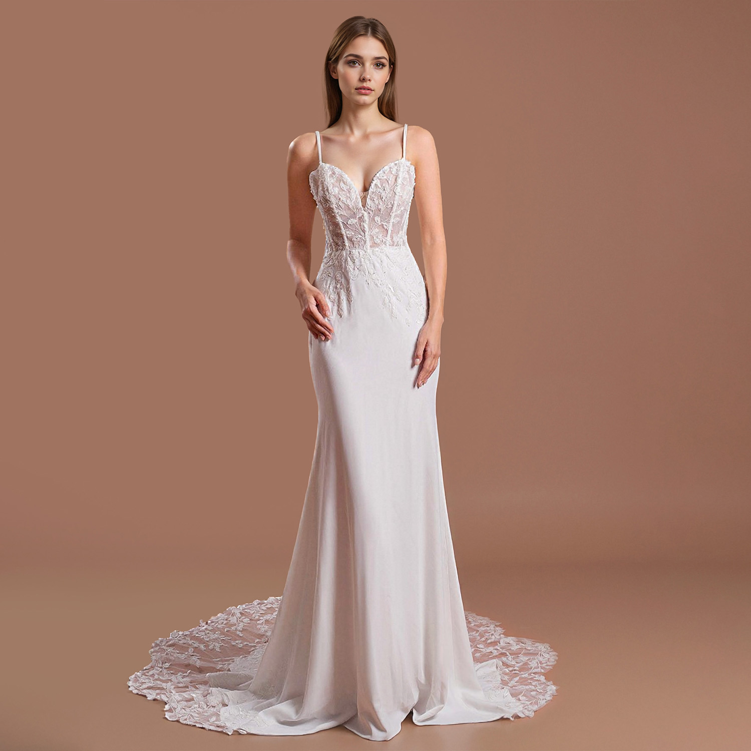 This ethereal chiffon wedding dress features an illusion neckline embellished with delicate appliqués. The lightweight fabric drapes beautifully, creating a romantic silhouette, perfect for a whimsical outdoor ceremony or an elegant indoor affair.