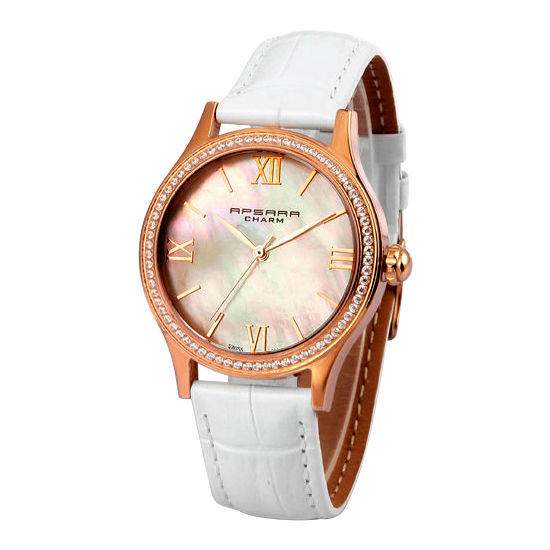 Decorated with diamonds, this timepiece sets you apart with its beautiful shine oozing out. The watch boasts a ladylike appearance with a mother-of-pearl dial and indicates time with slim indices and pointed hands in the same tone. Well manufactured with Swiss movement, this is also a functional one for daily wear.