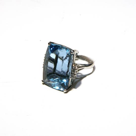 The featured item is a ring set with a faceted aquamarine stone. The ring and stone can come in various sizes.