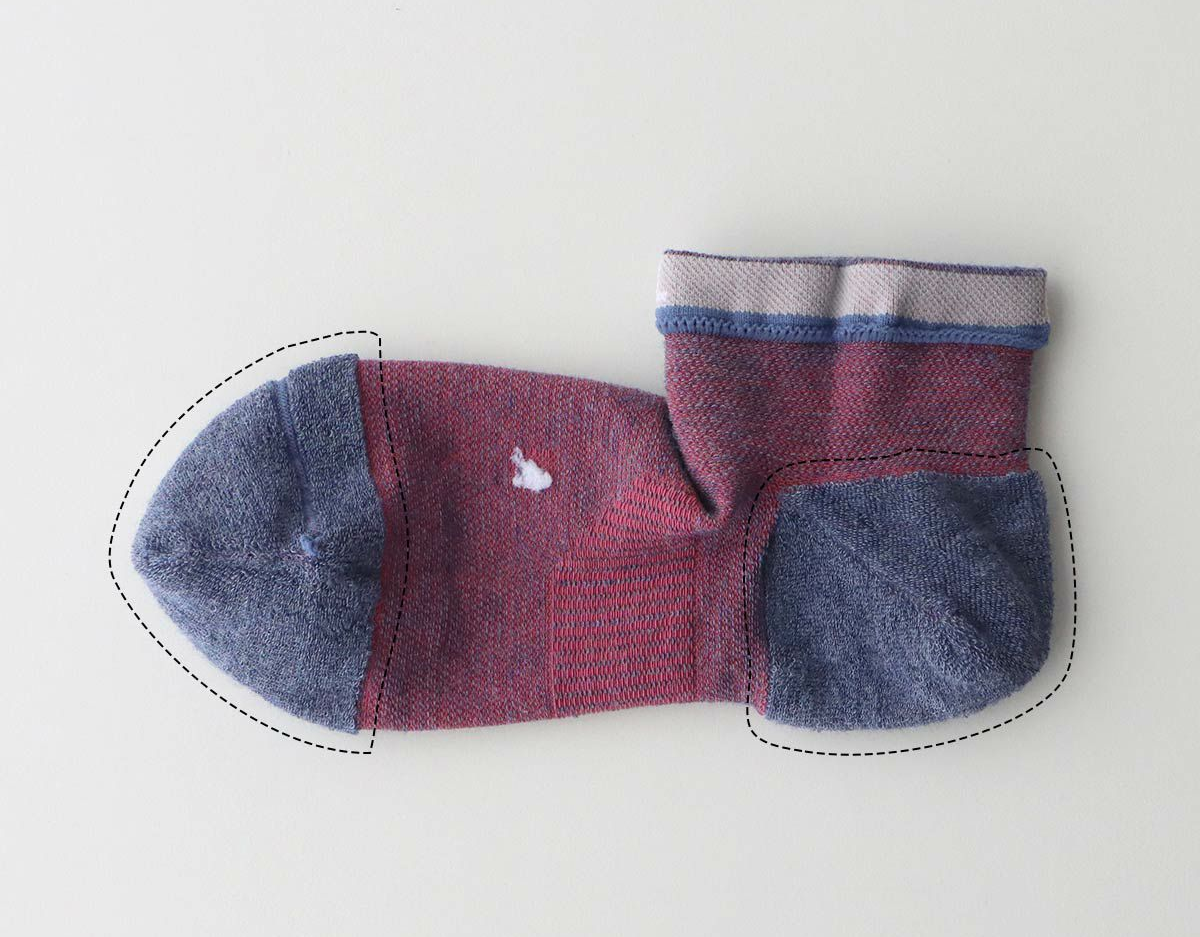 The sock functions preventing the declination of the arch by its original function of “arch fit supporter”, made of specific material and technical structure to provide different power of supporting & compression. Hence, relieves fatigue.