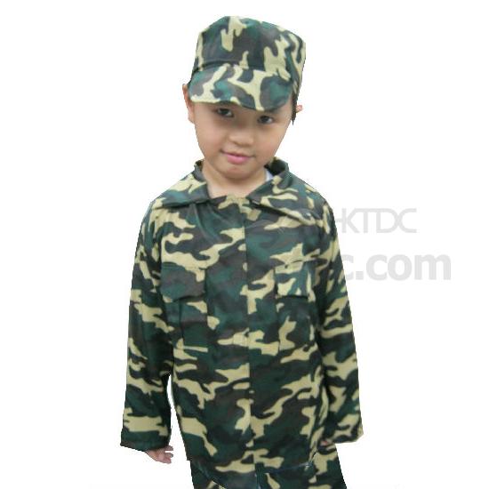 This army suit set is made of woven polyester and is suitable for kids aged 5-10. It includes a long-sleeved army uniform in camouflage patterns, a pair of matching pants, and a hat. The army suit set is comfortable to wear and is excellent for kids to play dress up.