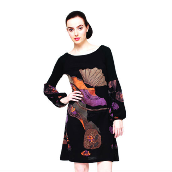 This long-sleeved one-piece dress features a print that is inspired by Salvatore Dali’s surreal works of art. Cut in a flowing A-line shape, the dress features muted lantern sleeves and a wide, bateau neckline. This decent dress makes a nice choice for dating or other social occasions.
