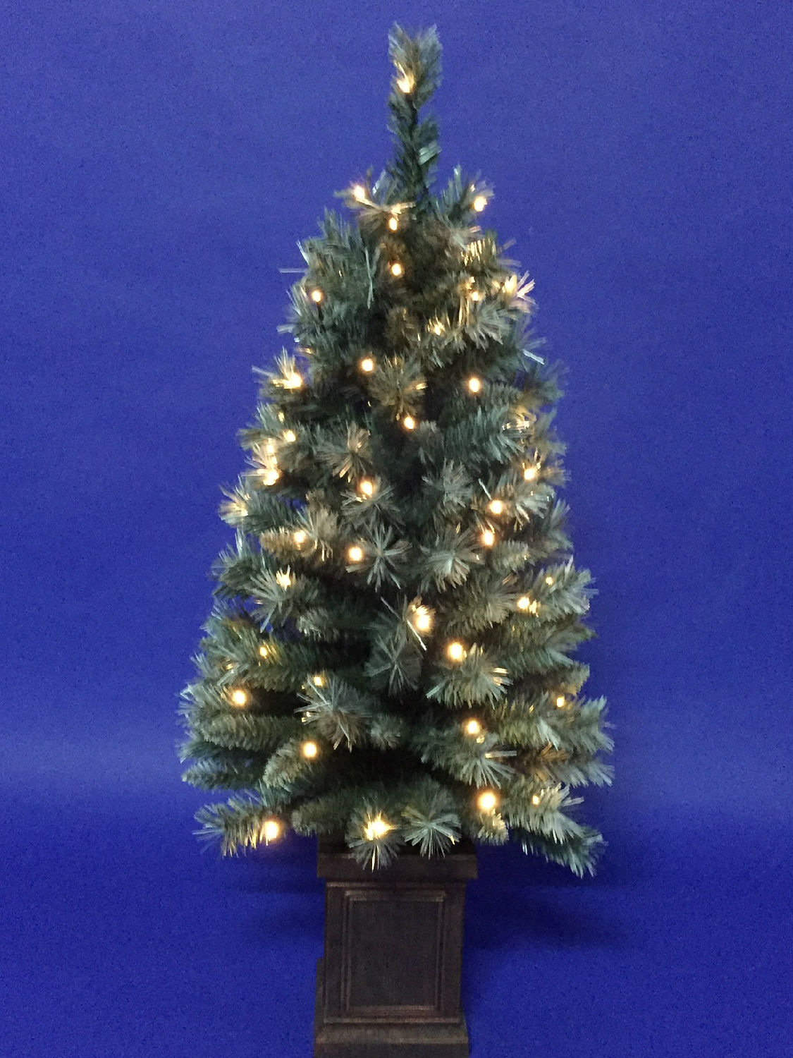 Celebrate the season with this artificial Christmas tree. Settling on an antique-looking box, the symmetrical pyramid select styles evenly spaced branches and needles of realistic frosted finish to adorn interiors. Tiny bulbs are further included for cozy illumination after dark.