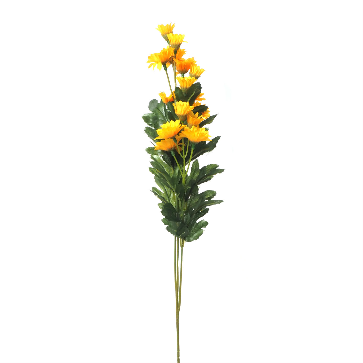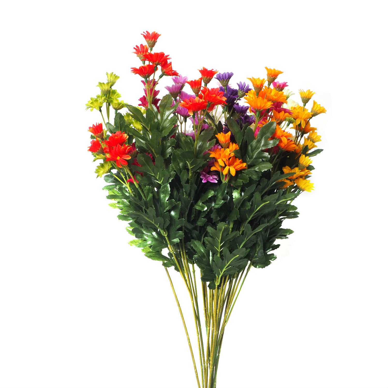This daisy bundle is made of fine polyester for holding its vital appearance for years. Decorated with shiny green leaves, this arrangement brings endless energy to any space with a rich color combination of red, purple, orange and yellow. Add a cheerful splash of colors to your home with this vibrant one.