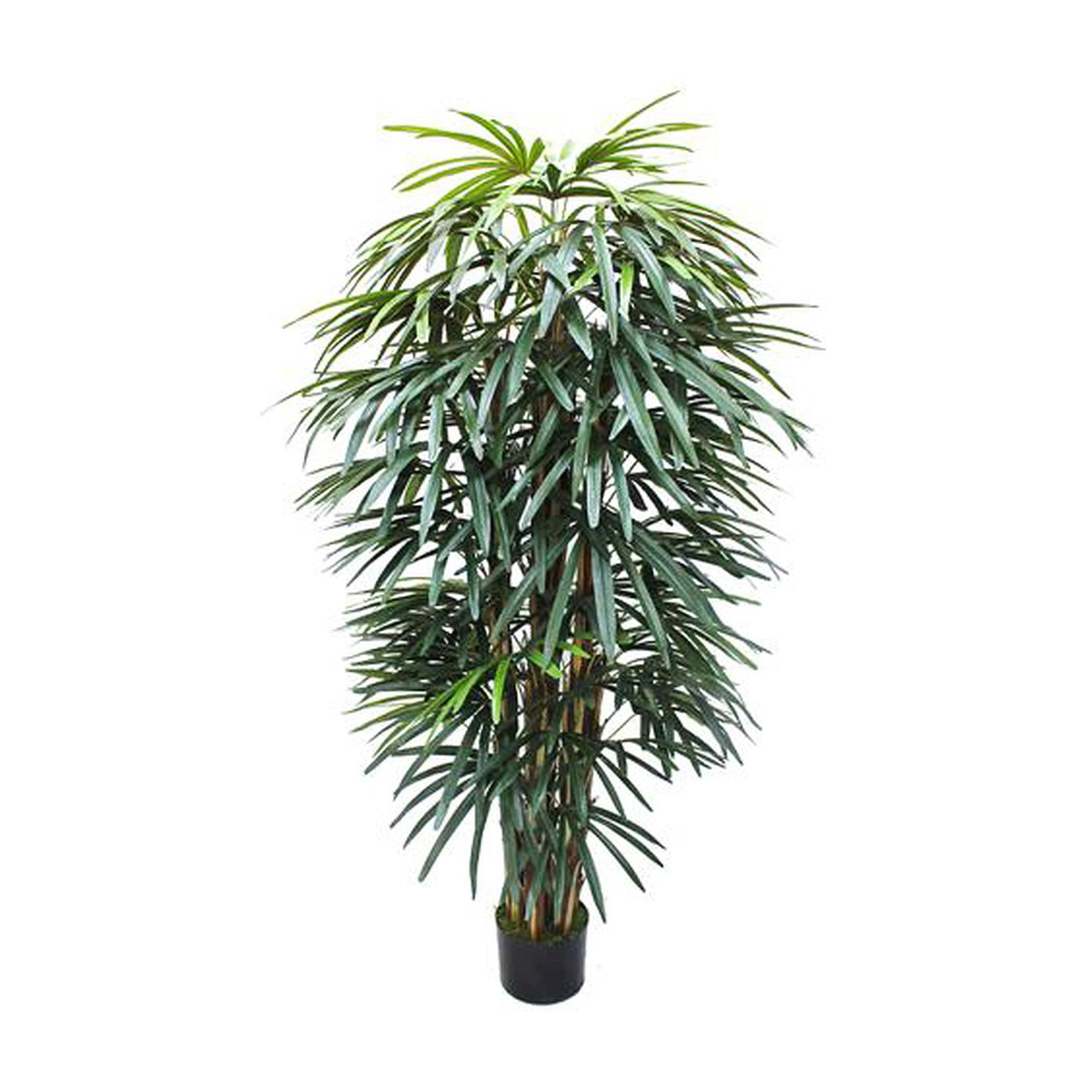 The artificial plant of the raphis palm tree plant on a plastic base.