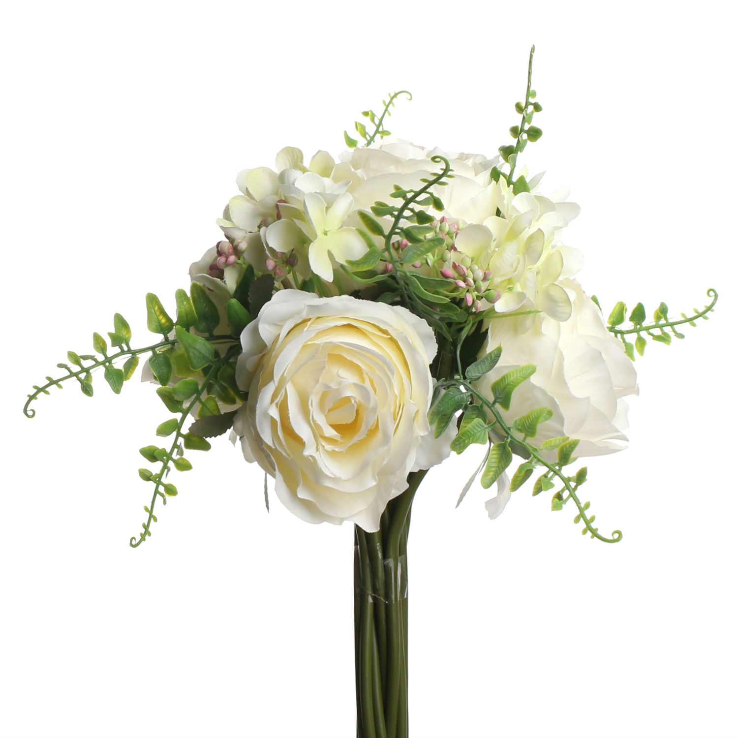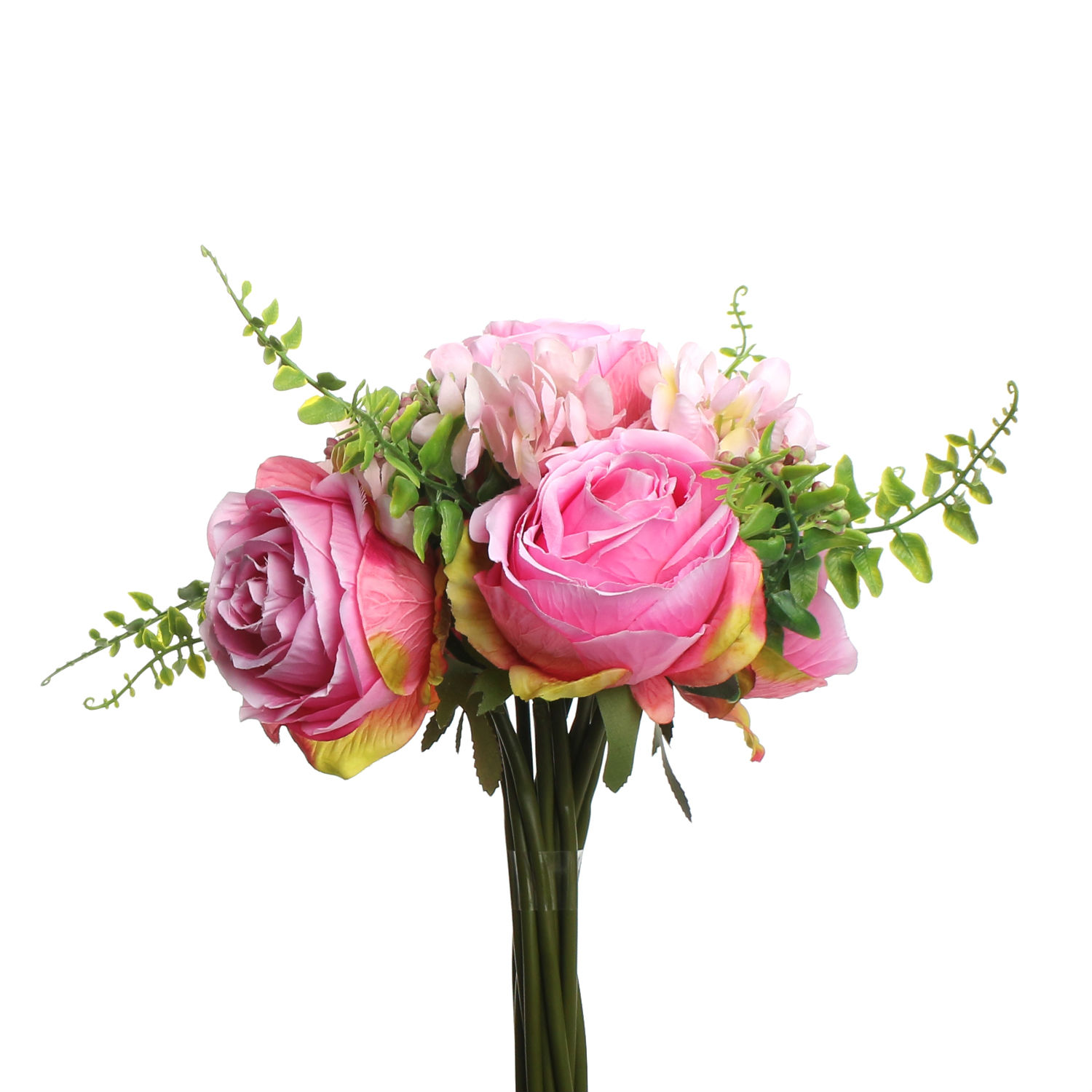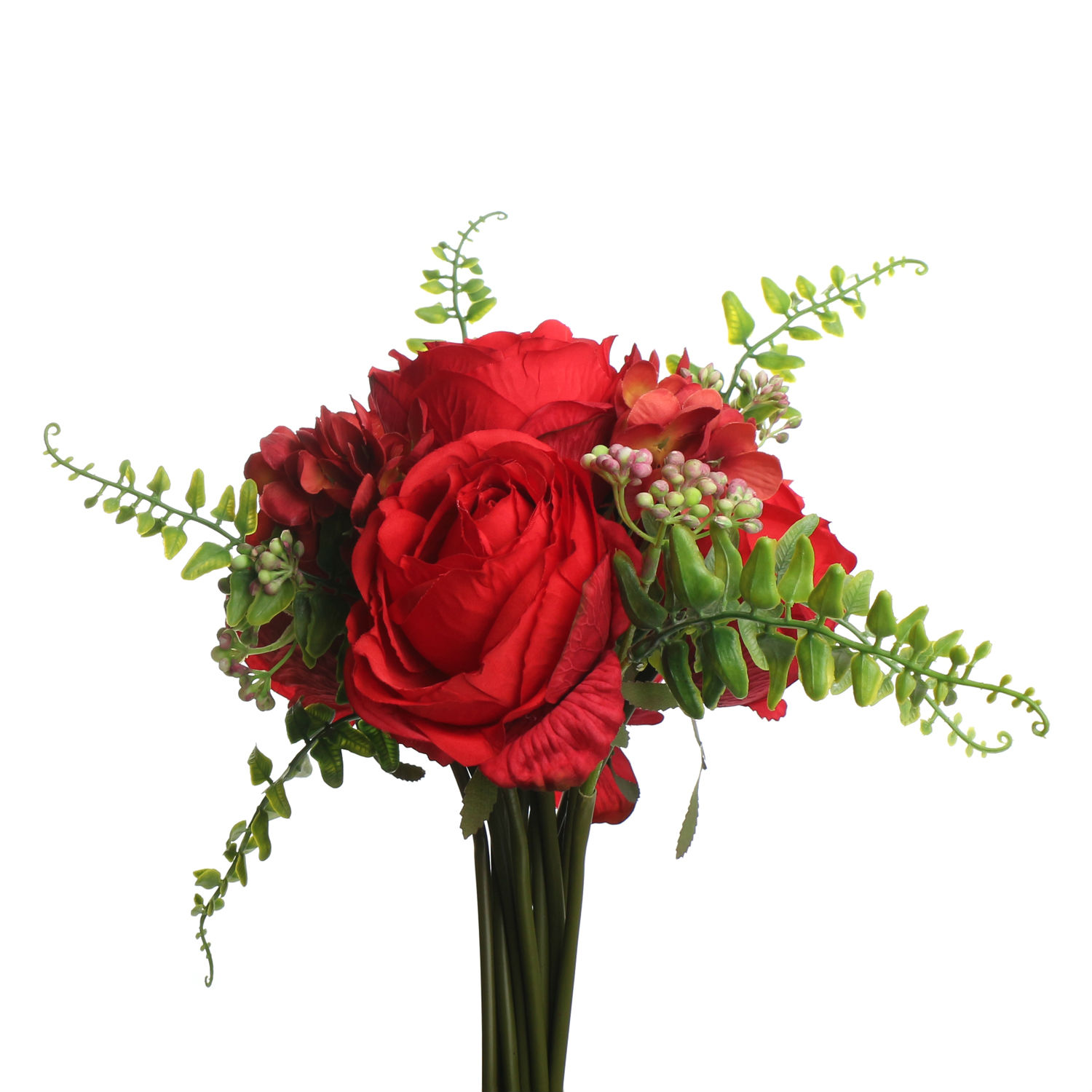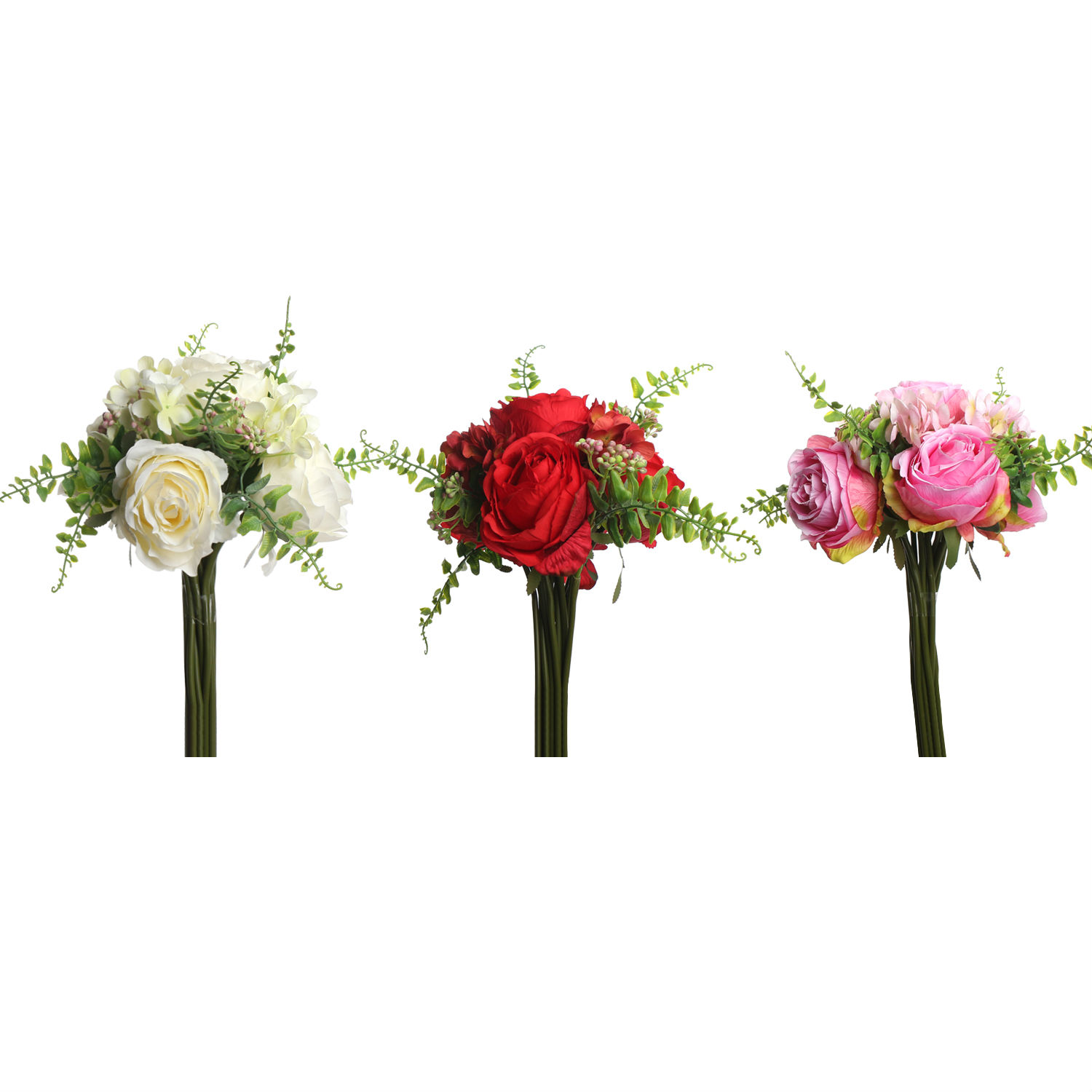 Tied with large roses blooming from the contrasting leaves, these lavish bouquets are perfect enough to stand alone as an attractive wedding decoration. These polyester flowers mimic the real roses with soft petals, beautiful hues, and meticulous details, elevating your decor with an instant romantic flair.