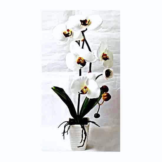 This exquisite artificial white orchid pot brings the stunning beauty of the garden to your home. It features vivid, delicate orchid flowers complemented by beautiful dark green leaves and a matching white pot. Brighten up your living room instantly with this lovely white orchid pot.