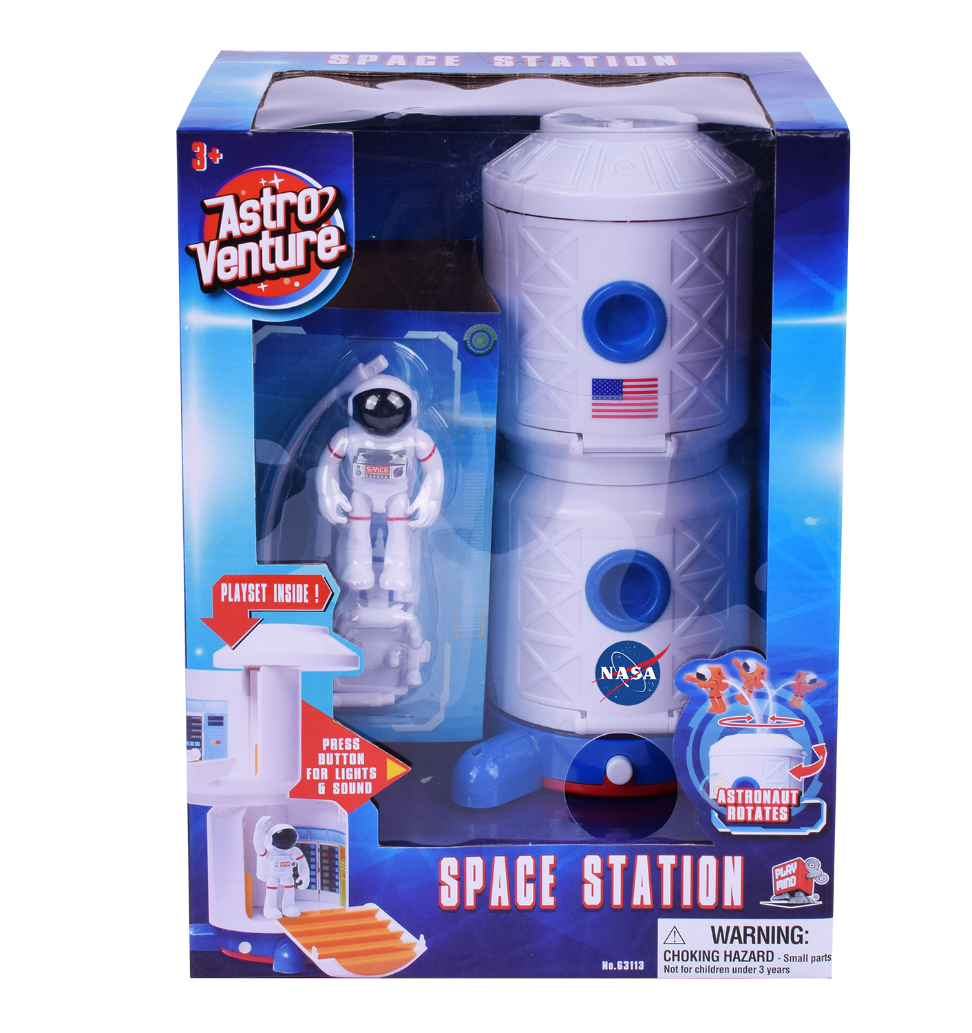 Featuring a 2-Level Space Station. Light & Sound. Astronaut figure and hover included. Astronaut can do space walk when attached to the tether at the top of space station.