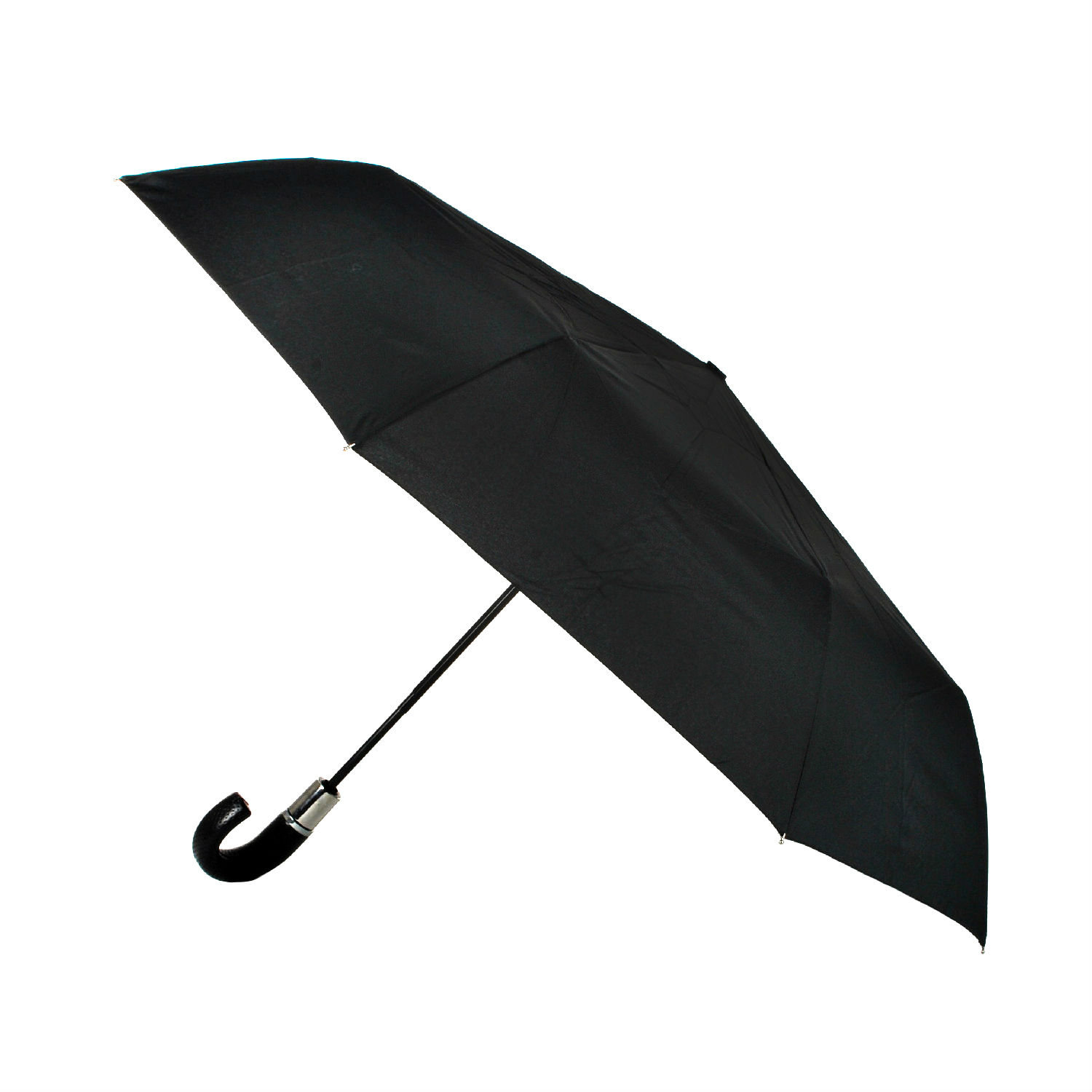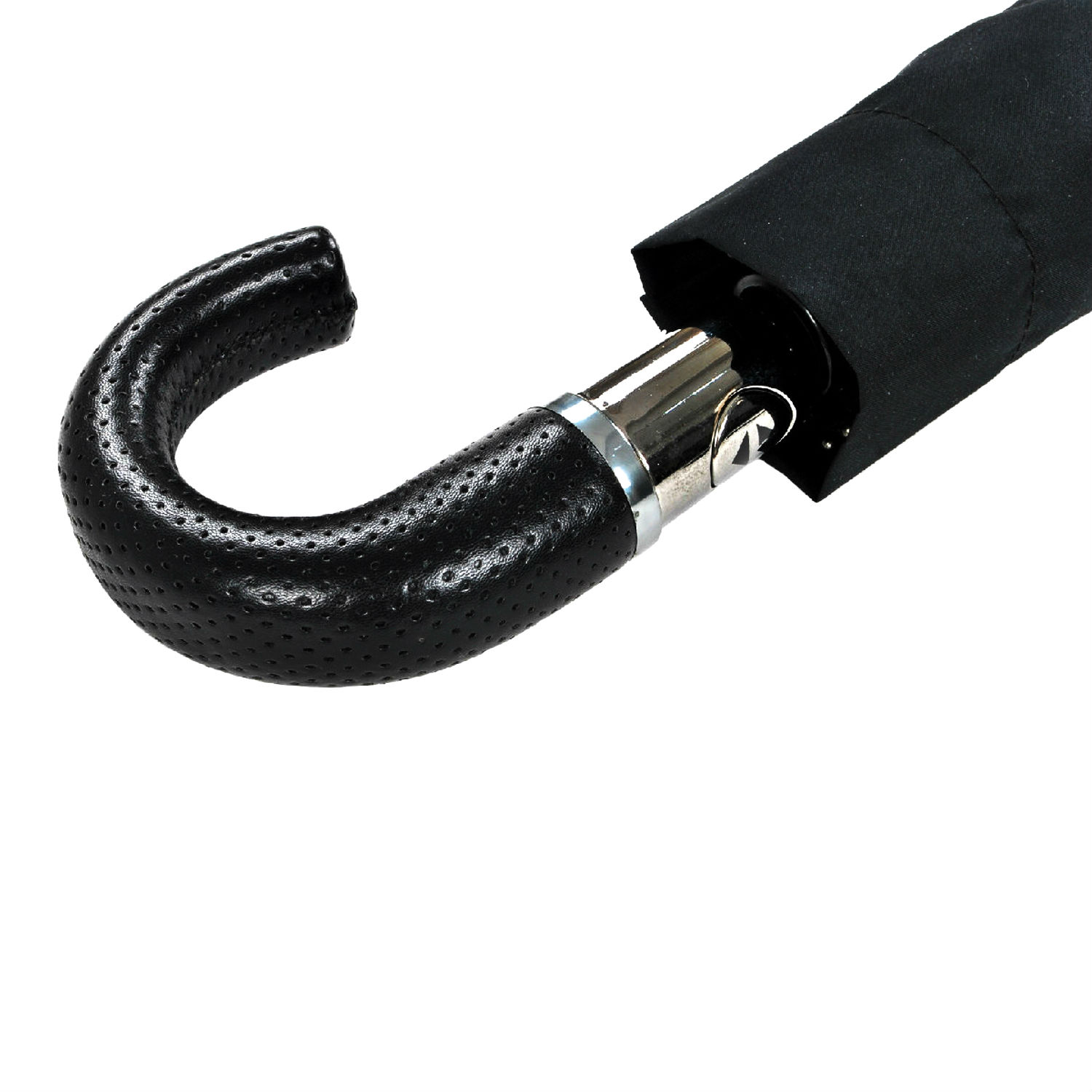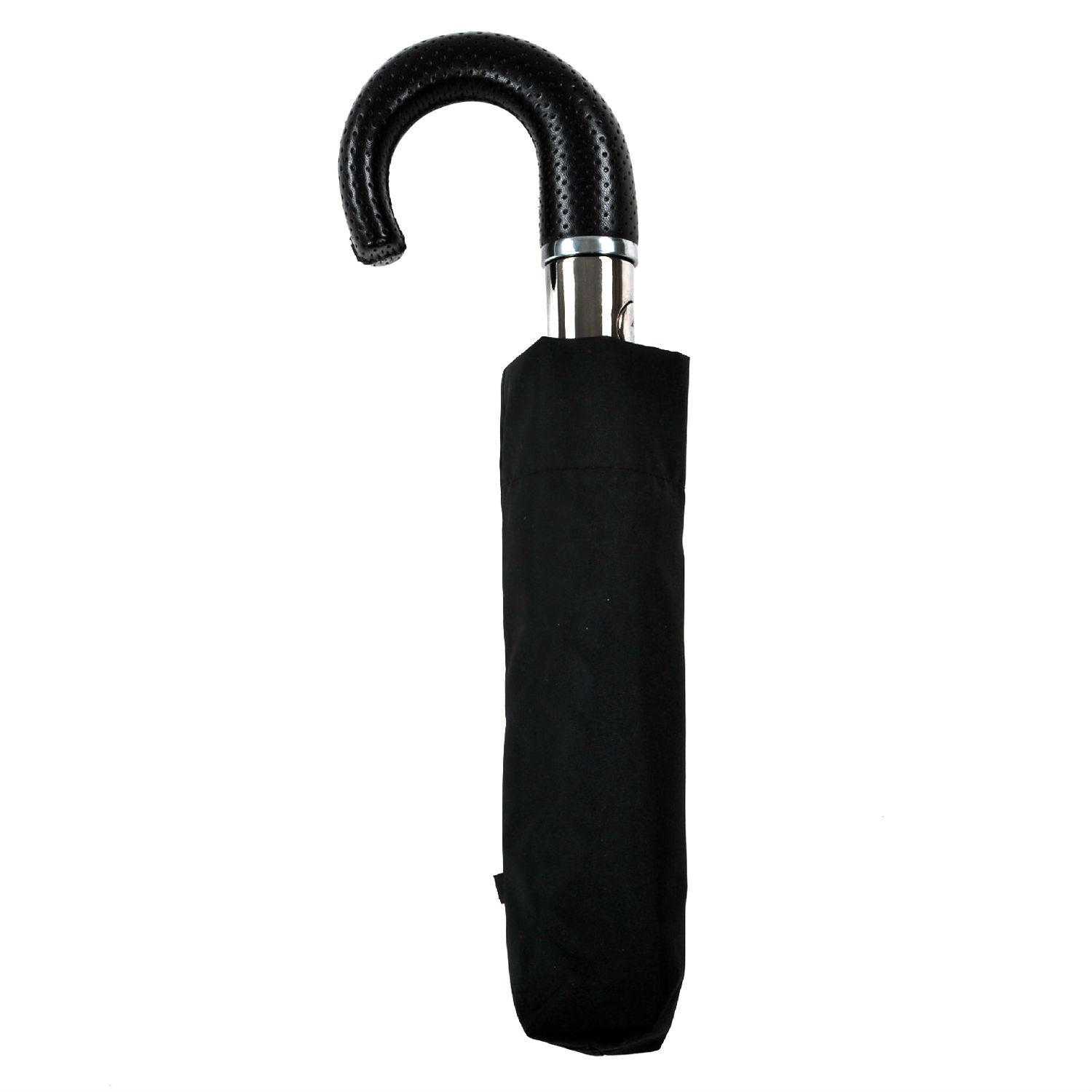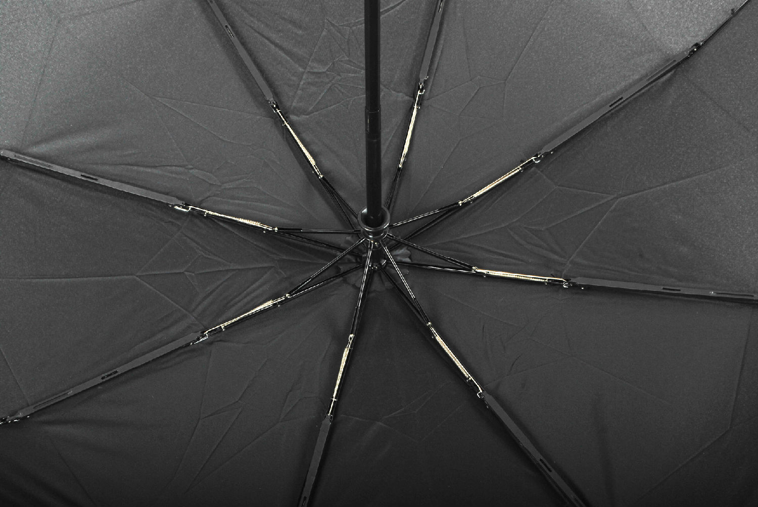 21"x 8 panels, auto open auto close, 3-fold black metal shaft, fiberglass ribs, black metal frame, metallic silver push button & curved plastic handle cover by faux leather, pongee cover with sleeve