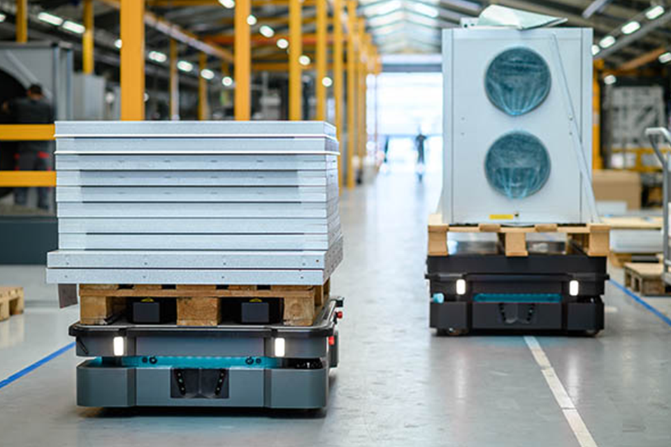 AGVs are designed for heavy item handling, using magnetic strips, laser, or vision navigation for autonomous movement. They select optimal paths and collaborate with other systems for efficient operations.