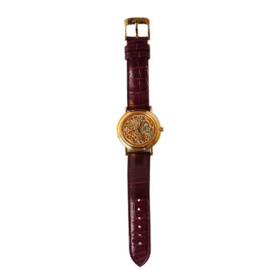 This handmade automatic skeleton watch exemplifies sophisticated craftsmanship. The decorative dial is produced with exceptional skills and expertise. The round golden case is paired with brown alligator straps in brown for a modest look.