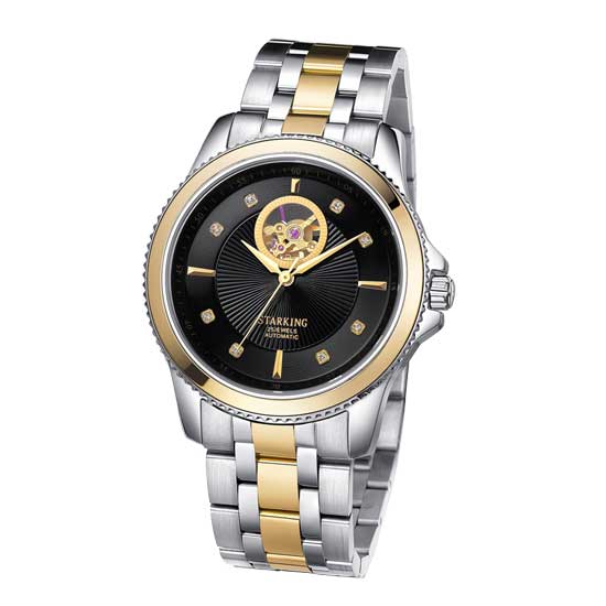 This automatic watch features a black dial face with three golden-hued hands, shiny stone hour markers and a round detail showing a part of the movement. The durable band comes in silver and golden colors for a luxurious touch. This high-end automatic watch is suitable for various occasions.