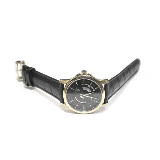 This is a men's automatic watch that features a pair of black leather bands, a golden round case and a golden buckle. The black dial is crafted with contrasting markers and sophisticated displays. This well-made watch surely is a great addition to your collection.