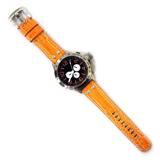 The bright orange-hued strap highlights this automatic watch easily. It also comes with a round black dial with three white hands and sub-dials, and orange-hued markers. This vibrant wristwatch is suitable for both men and women.