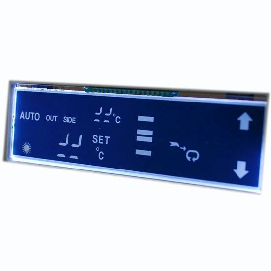 This automotive electronic display comes in a slim design. The white text and icons are shown over the blue backlight for easy reading. It is used in a variety of vehicles such as cars and buses.