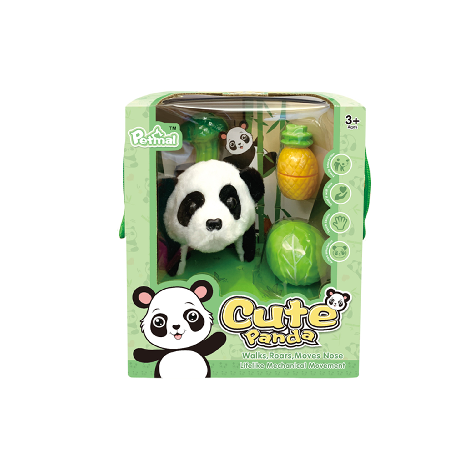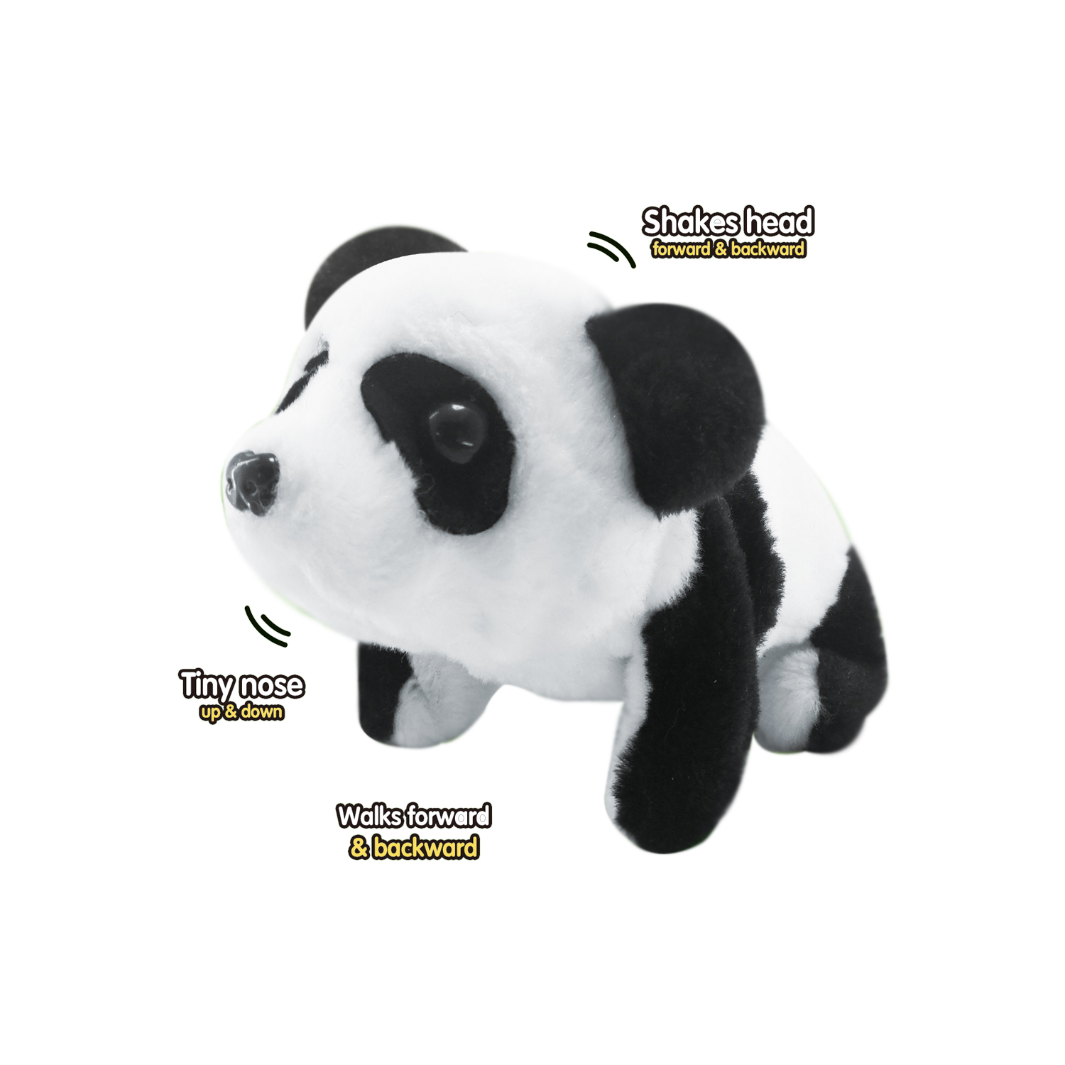 Cute fluffy panda which walks, move its’ nose and shakes its’ head.