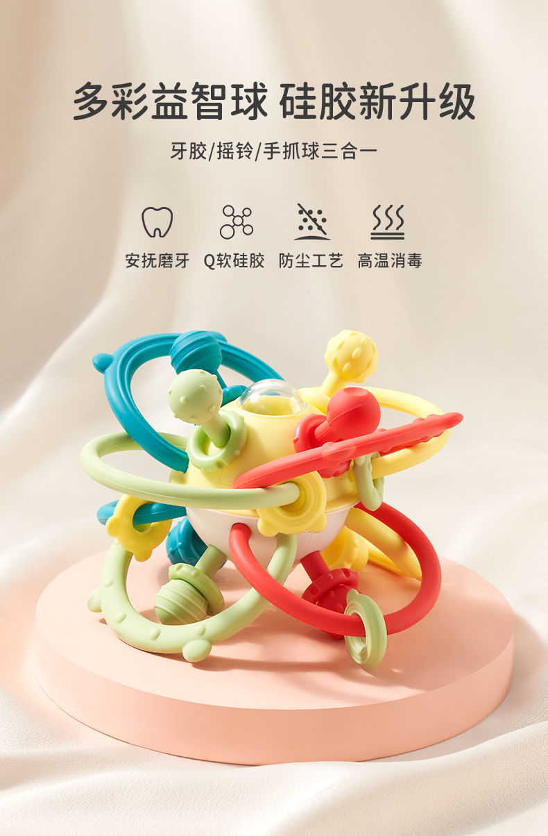 The toy combines silicone hand rope and silicone bite head function, can train the baby's hand grip function, while the design of multiple bite points can also solve the baby's oral period needs, shaking the top and bottom of the ring beads issued "sa sa" sound, more attractive to the baby's interest.