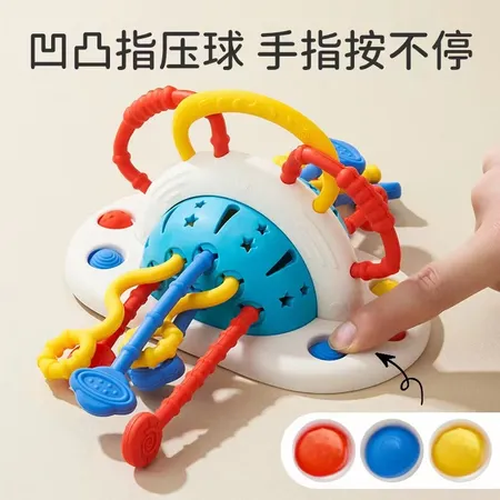 The toy combines a silicone grip cord with a pull-up cord and a push-button function,Enriched the fine finger training for babies and children, with suction cup design at the bottom,Can be firmly sucked on the table, baby children play on the table is not easy to fall.