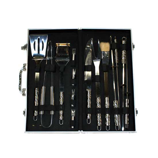 This 14-piece barbecue tool set is made of high-quality stainless steel for enhanced durability. This stainless steel BBQ tool set is packaged in an aluminum box for easy carrying. This well-designed tool set is a must-have item for barbecue lovers.
