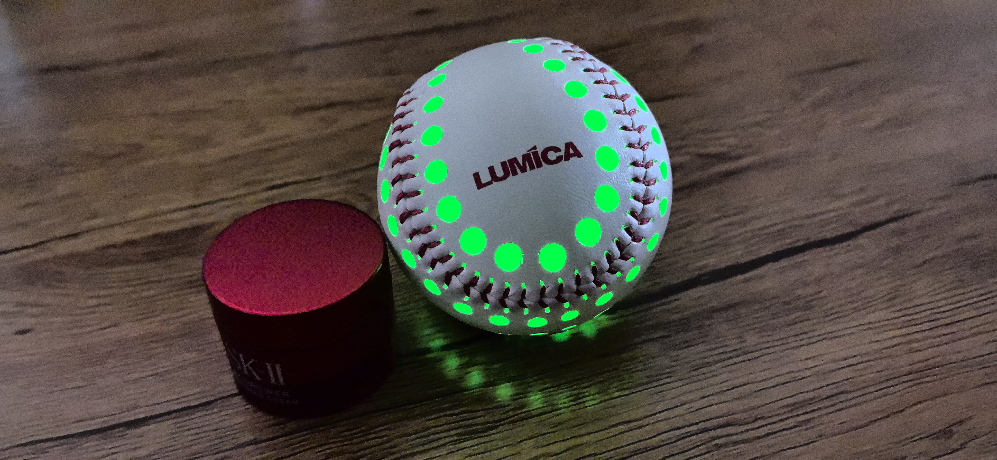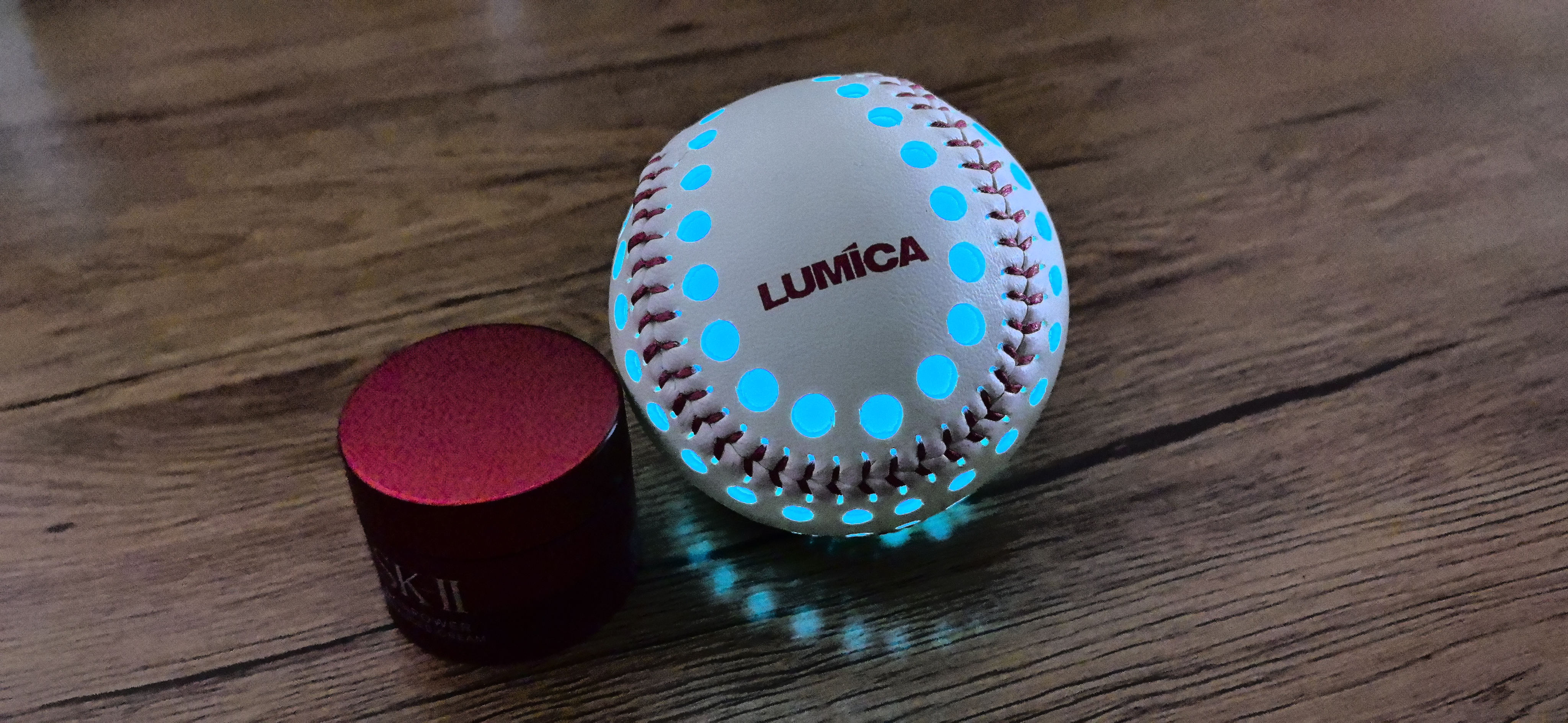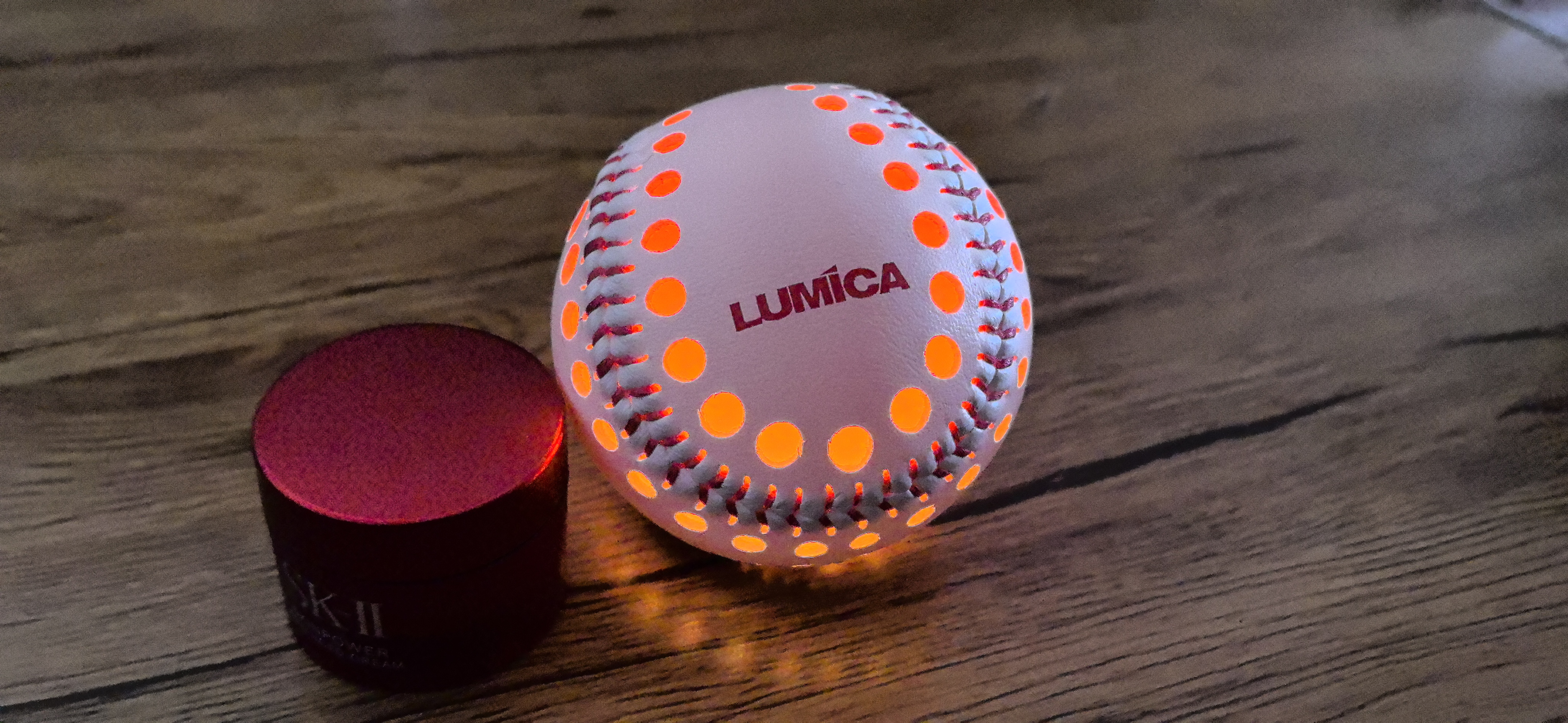 This LED - glowing baseball has a diameter of 70CM. It presents a classic baseball shape. The surface of the ball is printed with the word "LUMÍCA", paired with eye - catching orange dots and exquisite stitching, making it stylish and attractive.