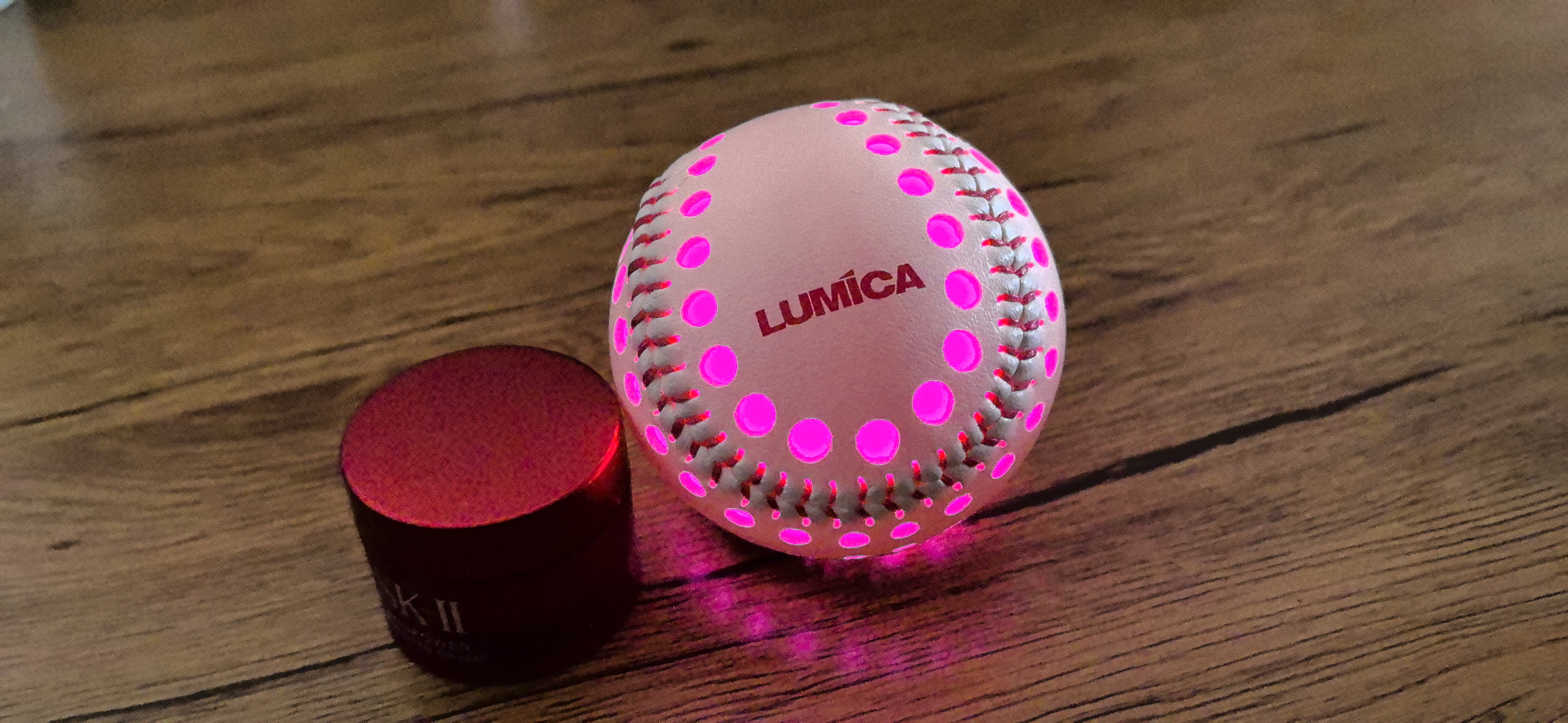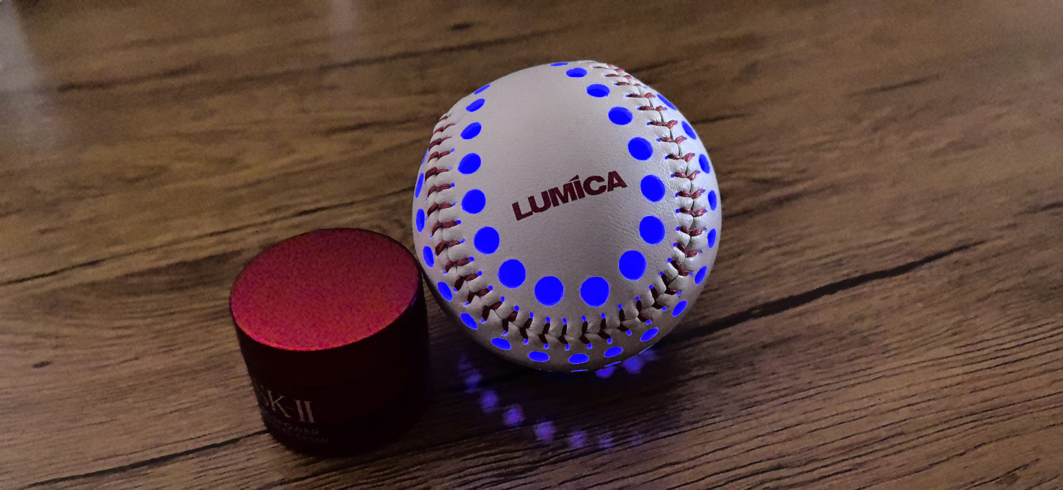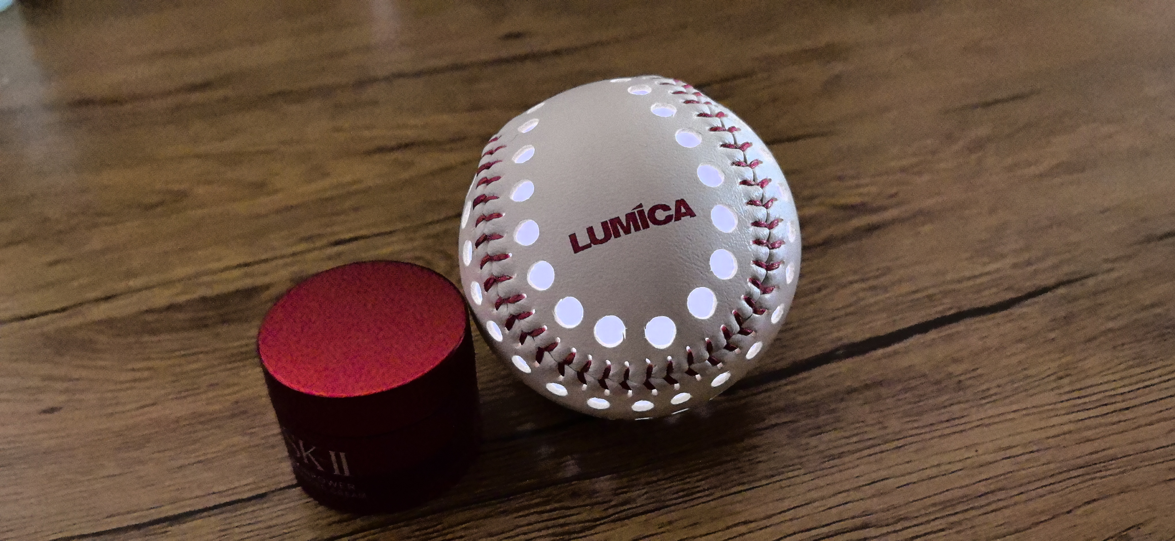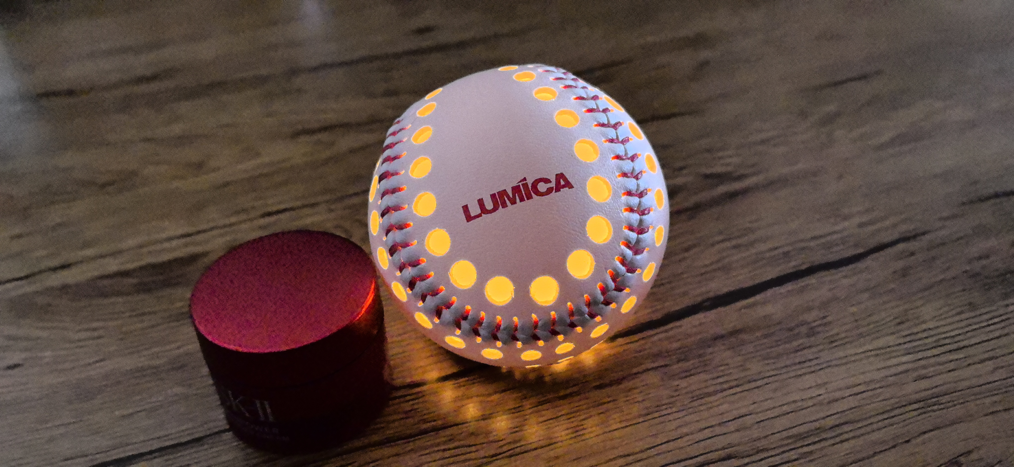 This LED - glowing baseball has a diameter of 70CM. It presents a classic baseball shape. The surface of the ball is printed with the word "LUMÍCA", paired with eye - catching orange dots and exquisite stitching, making it stylish and attractive.
