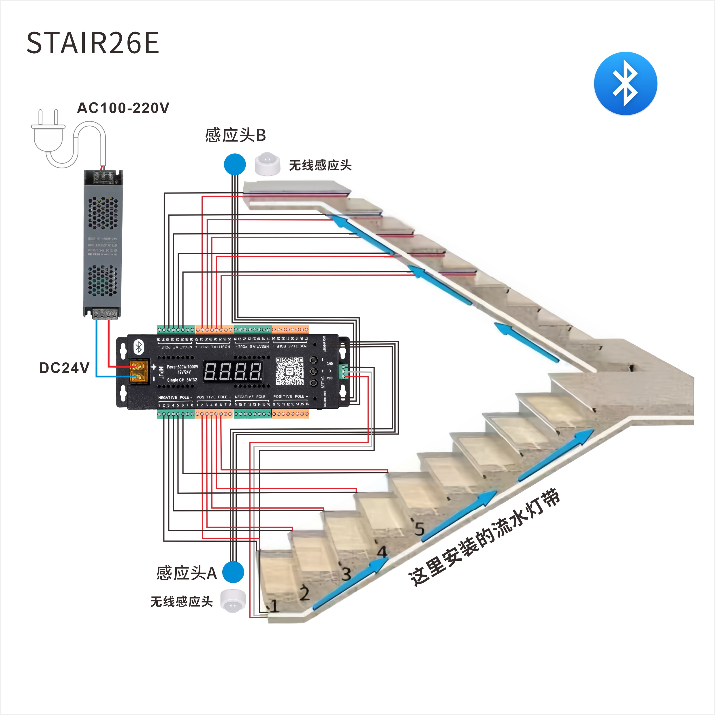32-bit Bluetooth staircase controller, can be controlled through a mobile app, with customizable adjustment modes