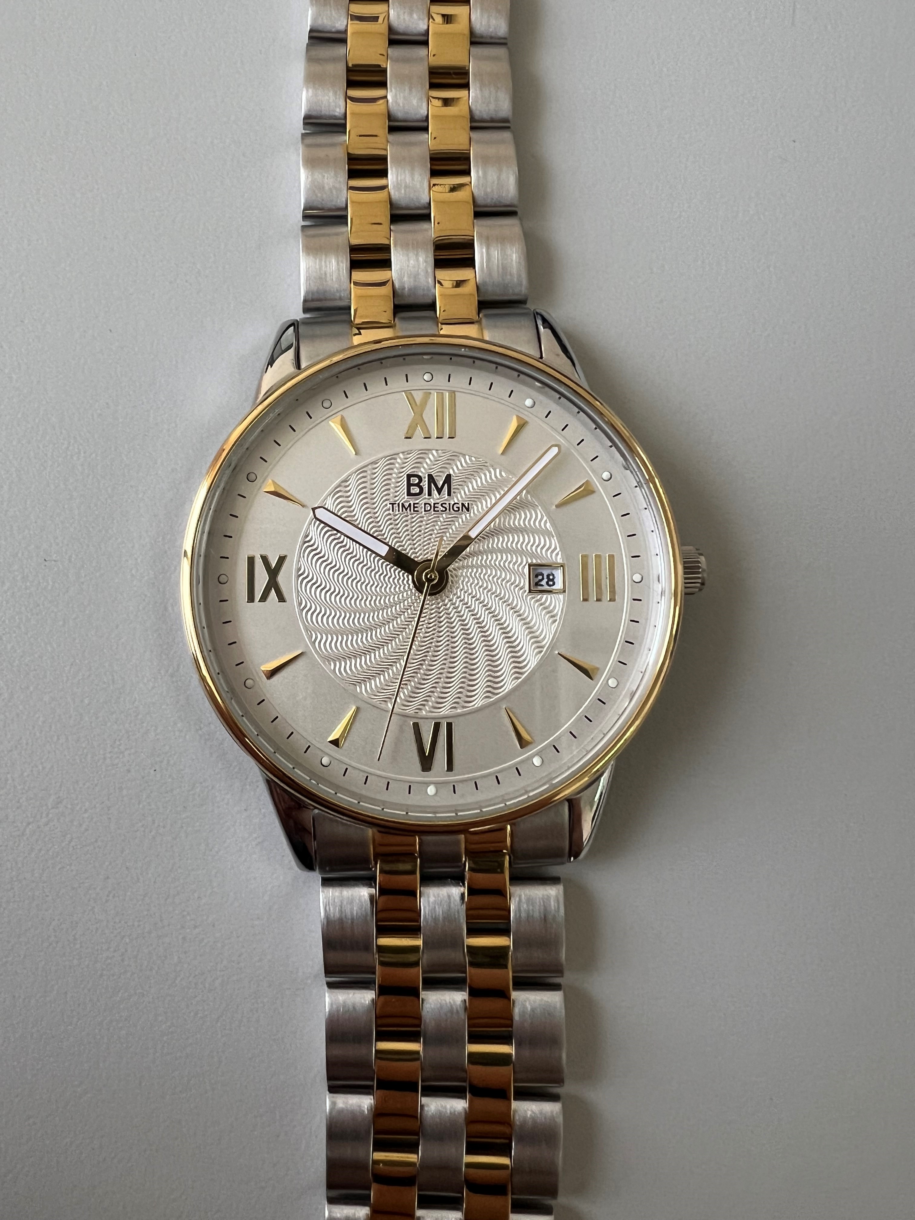 This watch features a round silver dial with a textured center pattern. Gold Roman numerals mark the 12, 3, 6, and 9 o'clock positions, with gold indices for the other hours. There's a small date window near the 3 o'clock position. The case is silver with a thin gold bezel, and the bracelet is a combination of silver and gold metal links. The brand "BM TIME DESIGN" is printed below the 12 o'clock position.