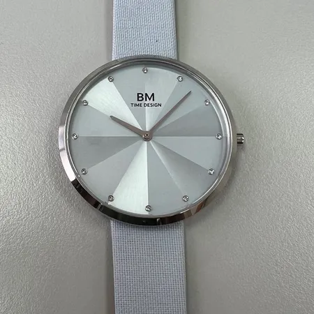 This watch has a minimalist silver dial with a starburst pattern and small gemstones marking the hours. The case is polished silver, and the strap is light gray with a textured fabric. The brand "BM TIME DESIGN" is printed at the top.