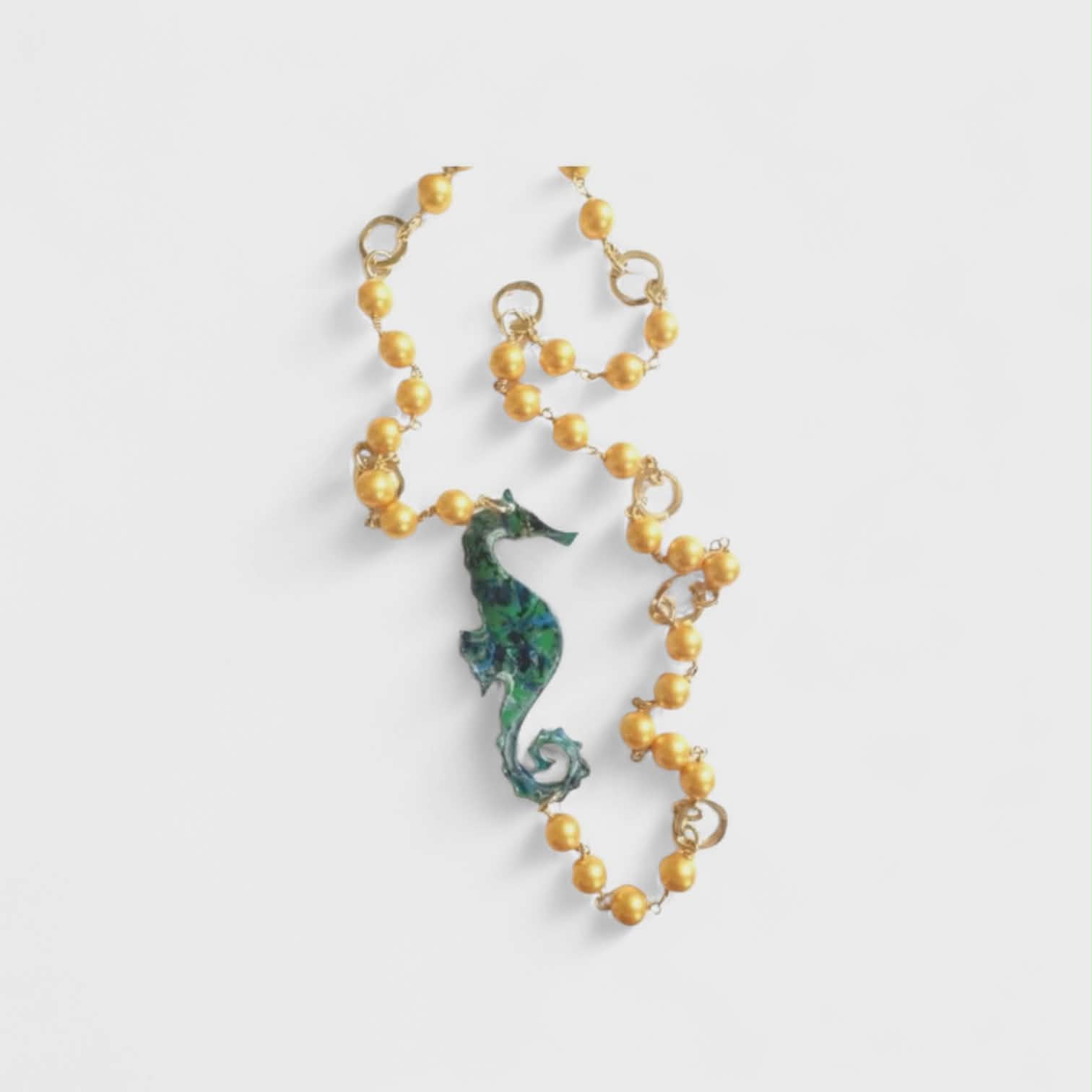 Champagne shell pearls long necklace accented with upcycled sea horse made of plastic grocery bags made into plastic sheet
