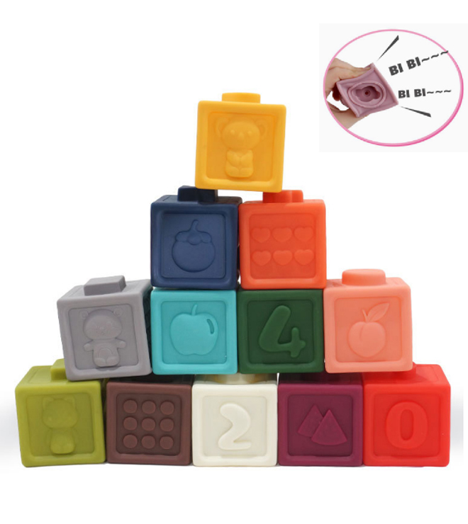 ♥ These blocks are made of vinyl ,easy to squeeze to make a squeaking sound for toddlers and babies to play. They can be cooked at high temperature (120 degrees )without deformation, no Balancing. They are soft , have no sharp water chestnuts, durable and easy to lift and stack with baby’s hand, can be pressed together.