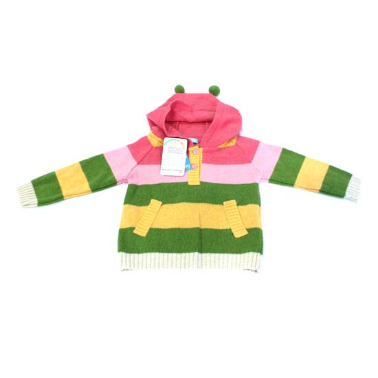 Shown here is a lovely hooded sweater for babies. The sweater looks exceptionally cheerful with striped patterns in sharp colors. Made of quality wool, the sweater can keep babies warm and comfy in winter. Two woolen balls are added on the hood for extra style.