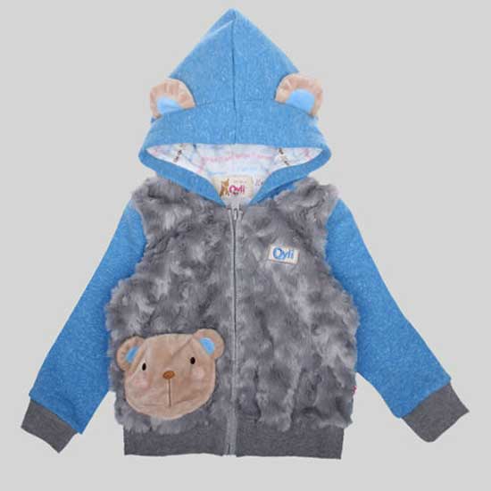 This babies' hoodie in blue and gray features an animal-themed design. It is adorned with ears on the hood and an oversized bear-like pattern at the pocket position for cuteness. The furry front is surely soft and comfortable to the touch.