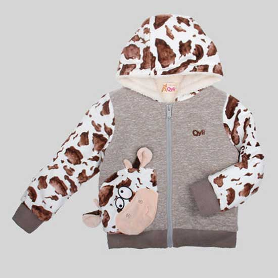 Displayed is a babies' hoodie that comes in a lovely design. The hood and long sleeves have cow patterns and the right pocket is decorated with an oversized cartoon cow's head for a fun effect. This babies' hoodie is made of high quality materials for your baby's comfort.
